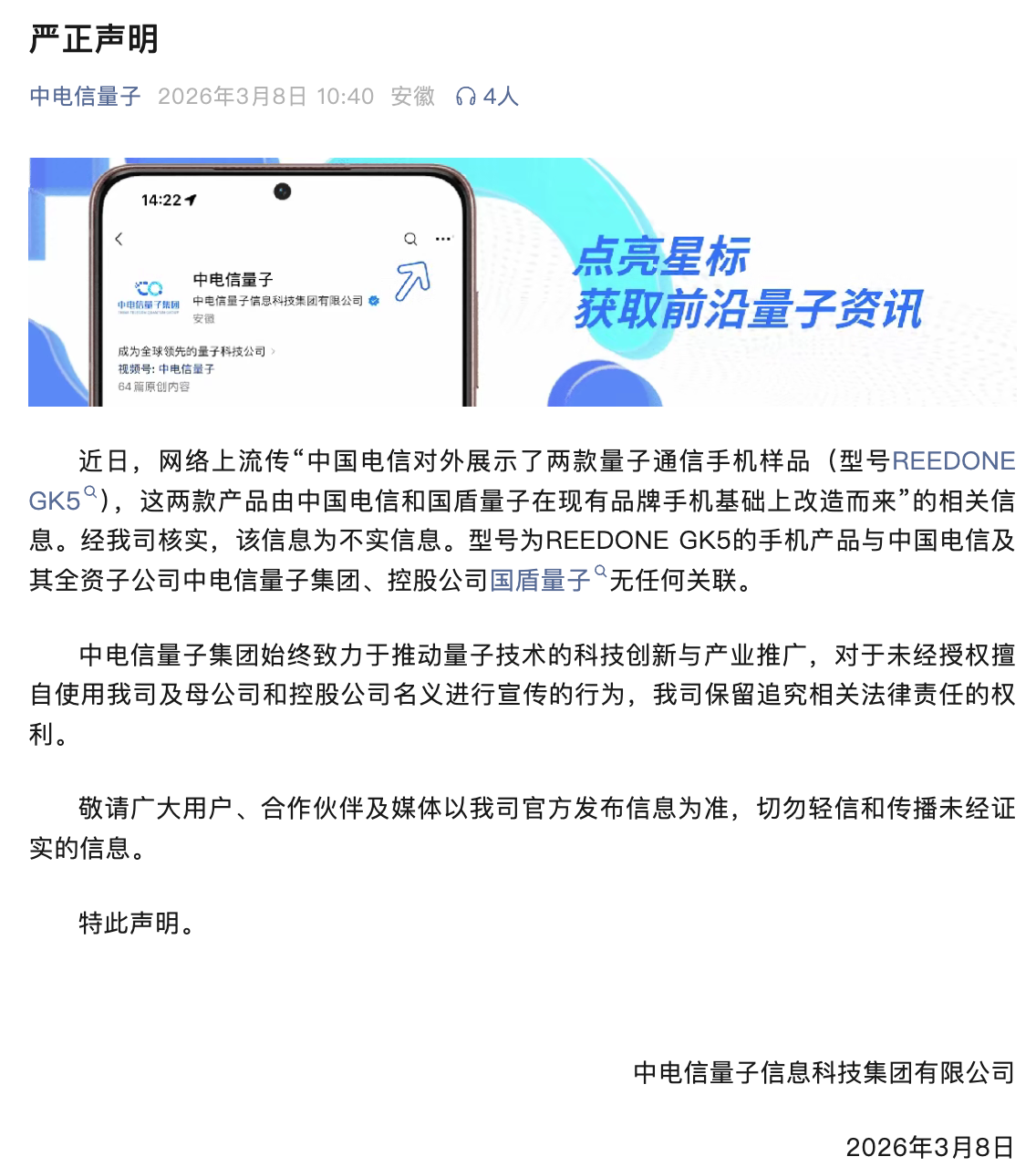 近日,网络上流传“中国电信对外展示了两款量子通信手机样品(型号REEDONE GK5),这两款产品由中国电信和国盾量子在现有品牌手机基础上改造而来”的相关信息。经我司核实,该信息为不实信息。型号为REEDONE GK5的手机产品与中国电信及其全资子公司中电信量子集团、控股公司国盾量子无任何关联。