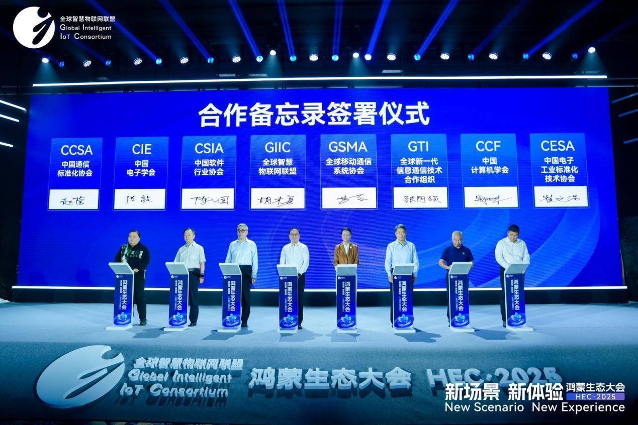 在合作备忘录签署仪式上,开放原子开源基金会理事长兼秘书长程晓明与全球智慧物联网联盟(GIIC)秘书长胡才勇首先签署合作备忘录,标志着生态在技术代码根基与产业生态推广两大核心领域实现历史性“握手”。而后,全球移动通信系统协会(GSMA)、全球TD-LTE倡议组织(GTI)、中国电子学会(CIE)、中国计算机学会(CCF)、中国软件行业协会(CSIA)、中国通信标准化协会(CCSA)、中国电子工业标准化协会(CESA)与全球智慧物联网联盟(GIIC)共同签署合作备忘录。来自国内外的多元力量集结,涵盖国际通信标准组织、国内权威行业协会及标准化机构,为鸿蒙生态注入全方位推动力量,促进生态在更广阔领域的规范发展与落地应用。